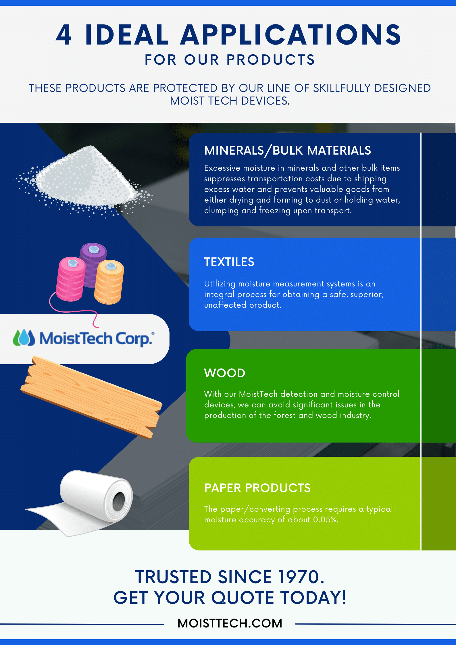 Many of the products that uphold the foundation of your life are upheld by moisture technology devices. MoistTech is a groundbreaking company trailblazing the moisture technology industry. From lumber to paper products to fine mineral materials and textiles, all are products protected by our line of skillfully designed moist tech devices.