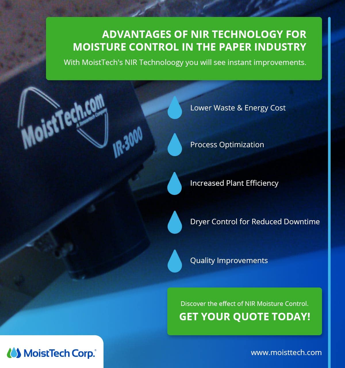 MoistTech Corp. has over 40 years of experience with NIR technology in a variety of industries with a proven track record for success. Discover the positive effects of NIR Moisture Control. Get your quote