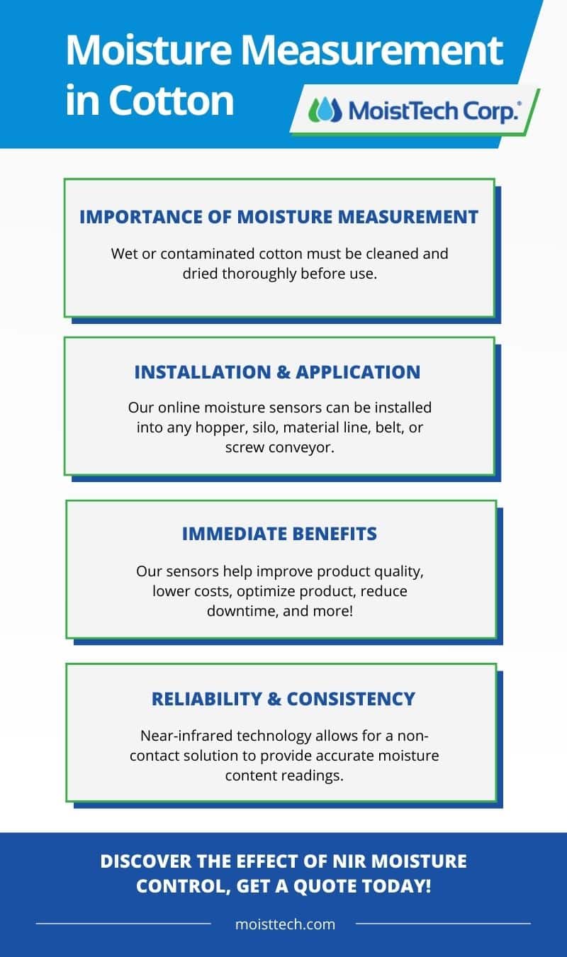 Using near-infrared (NIR) technology that allows for a non-contact solution to provide accurate moisture readings in cotton, MoistTech helps you avoid wasting product, inefficiency, inconsistencies in your product, environmental costs, and quality control. Our IR-3000 series of sensors are specifically designed to be unaffected by ambient light or material variations to provide continuous, repeatable, accurate readings to improve the manufacturing line and production of cotton. Keep reading to learn more about the importance of monitoring moisture levels in cotton and the benefits of our moisture sensors.