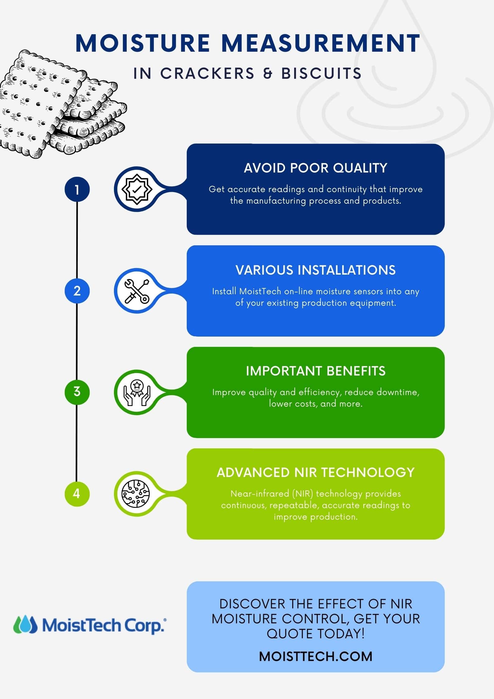 Discover the effect of NIR moisture control from MoistTech Corp and improve the manufacturing quality and efficiency of your cracker and biscuit production. Contact us for more information or to get your quote today.