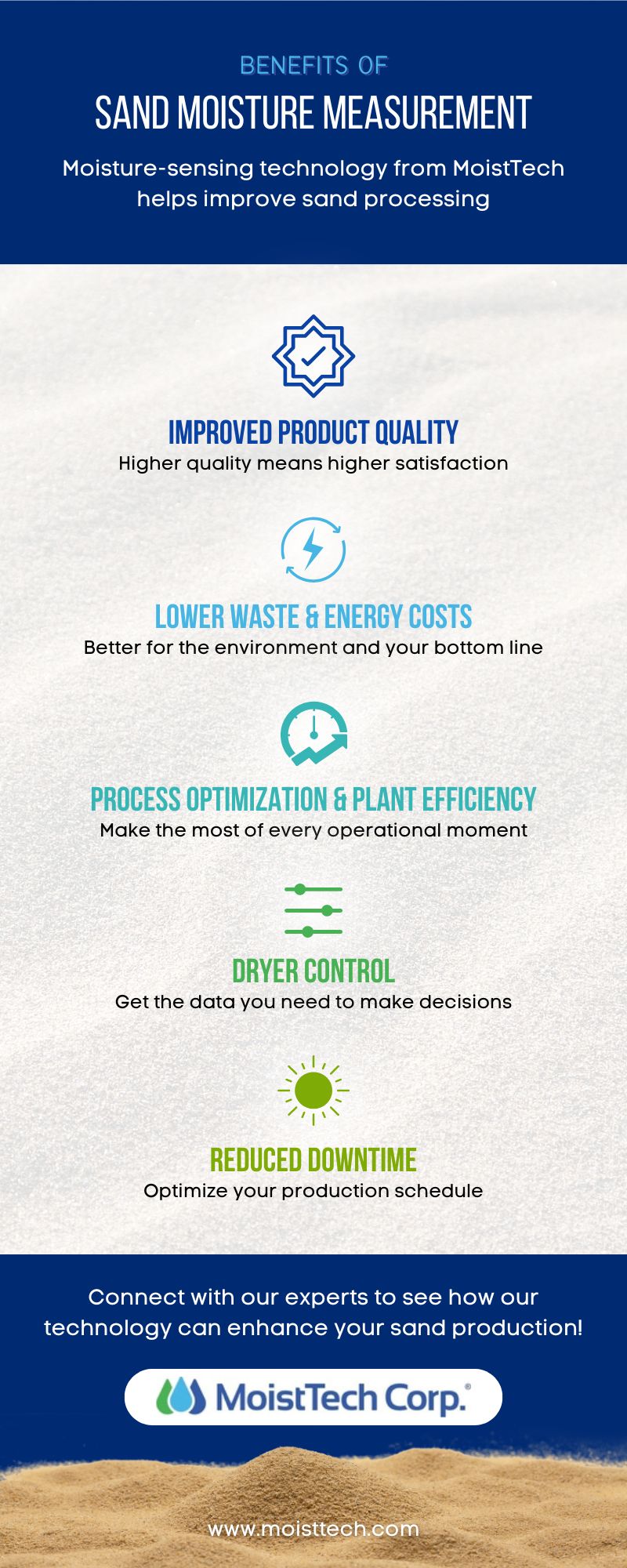 Here at MoistTech, we have developed a series of high-tech sensors to detect moisture in a variety of materials, including sand. We utilize near-infrared (NIR) technology for a non-contact solution to moisture content readings. NIR is insensitive to material variations, such as particle size or color, and they provide an accurate, continuous reading.