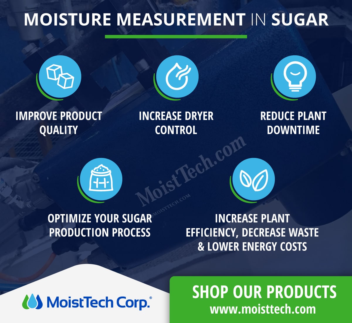 Moisture measurement is an important step in sugar production. With the help of our moisture measurement technology from MoistTech Corp, you can ensure your sugar is properly handled and stored, preventing any damage or hazards from occurring. Contact us today to learn more about our moisture control technology!