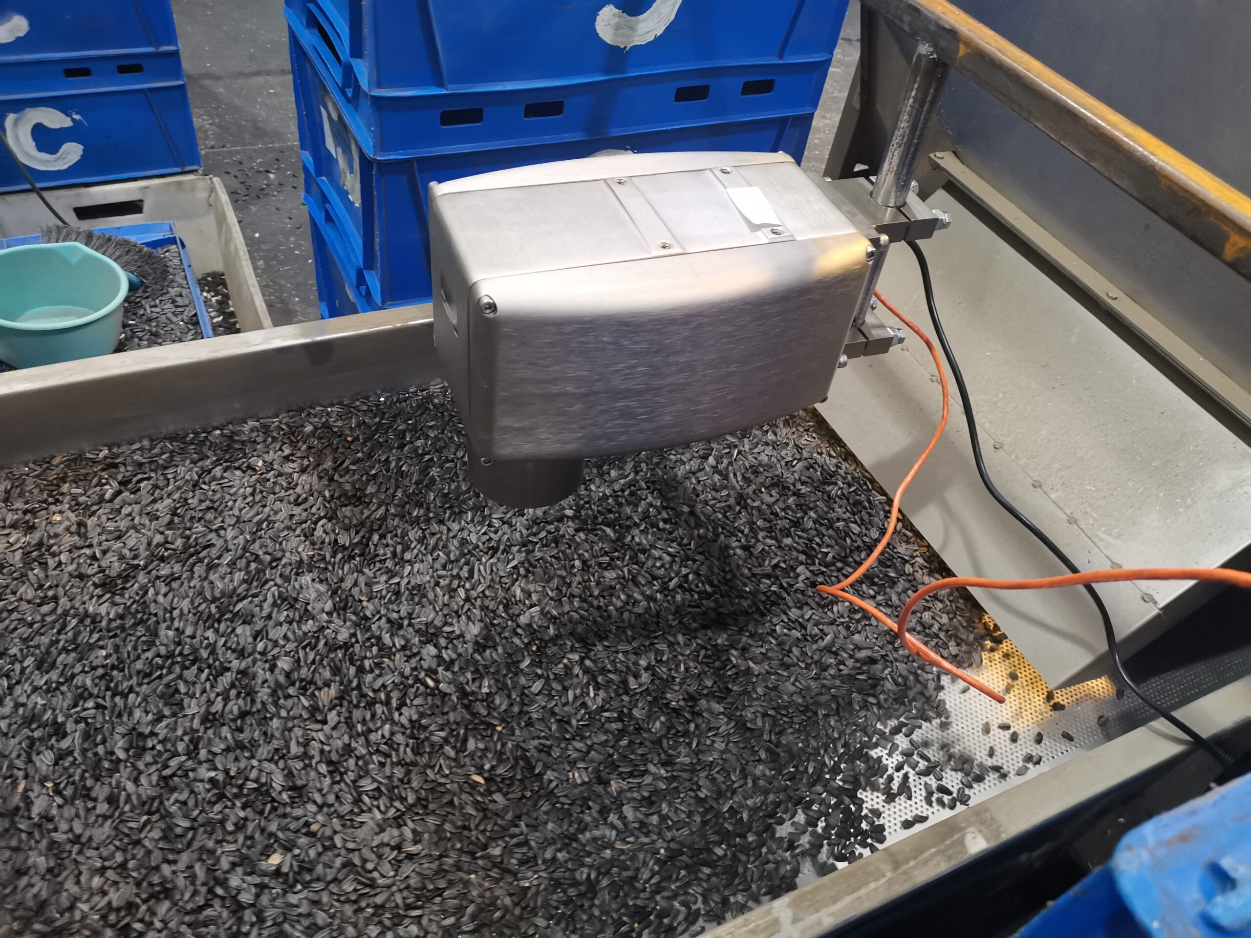 By mounting the sensor several inches above the conveyor and/or after the dryer so it can continuously monitor the process and can control the moisture content either manually or automatically in grains. Dust from the product is not normally a problem however in extreme dusty environments we recommend the installation of an air purge system to prevent the accumulation of material on the sensor’s window. If the sensor must be installed close to the dryer outlet where it will be susceptible to extreme heat conditions, it is necessary to cool the sensor with either air or water. Typical analog range is 1-10% moisture. The outputs can be adjusted to optimize PLC or recording requirements.
