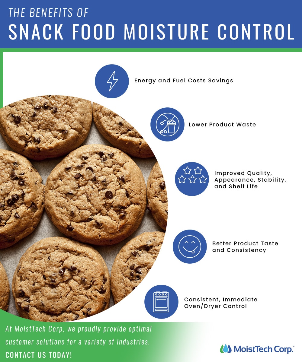 In the snack food industry, many of the product qualities are determined by the moisture content demands: taste, consistency, quality, and shelf life. At MoistTech Corp, we know that using the right snack food moisture management system will allow the user to have complete control over the manufacturing process, resulting in less waste and downtime, increased plant performance and product quality, energy savings via correct dryer control, and the ability to inspect all of the finished goods. Learn more below about the benefits of snack food moisture control, then contact us now to request a free quote.